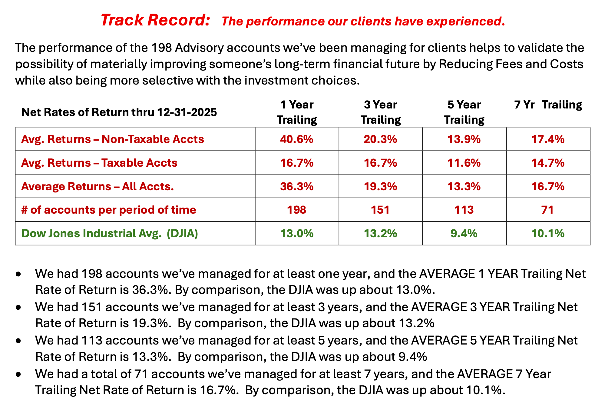 We at TN Wealth Management try to live by the golden rule, "Do unto others as you woud have them do unto you", which includes sharing things with you that your financial advisor either doesn’t know or just won’t tell you, such as the performance their clients have experienced with their investments. So unlike your advisor, we are sharing our 7 year track record for your review. Click the link to see the full report or preview an overview below.